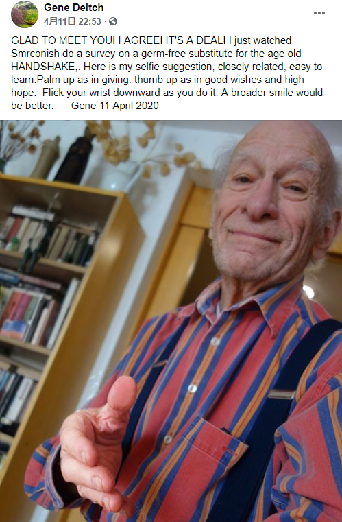 没错,九十五岁的戴奇是Facebook的资深用户。4月11日,戴奇发布了人生中最后一条动态,是关于疫情中如何“无菌握手”的。他建议大家,“掌心向外,以示付出;拇指向上,表达美好的祝愿;上下摇动你的手腕,咧开笑容就更好了。”