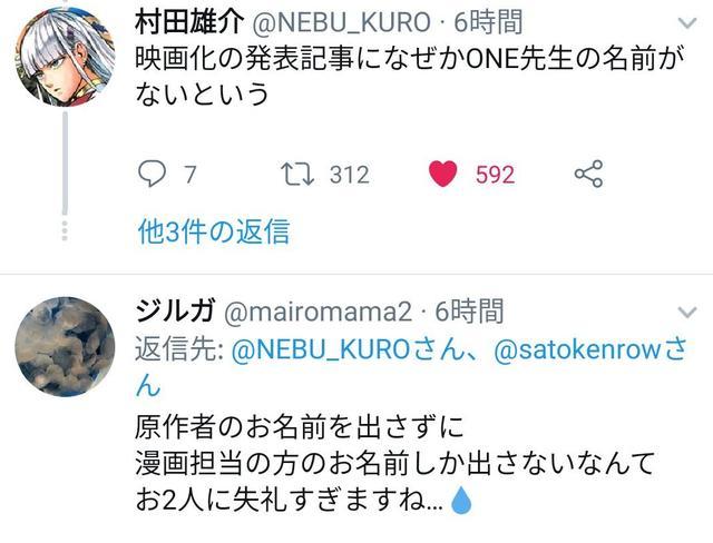 事情的起因非常的简单,就是一拳超人真人版电影,在欧美地区进行大规模企划的宣传和介绍时,只标注了重制版的作者村田雄介,但并没有标注ONE老师,这让村田个人非常的不满,果断发推文怒斥这种行为。