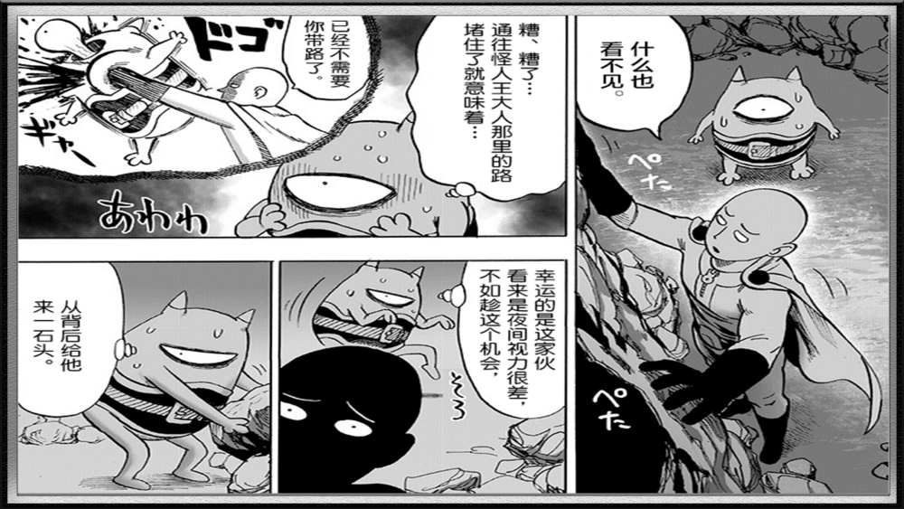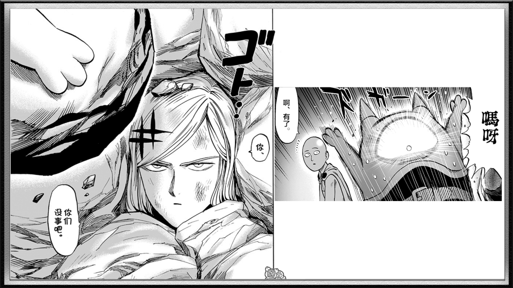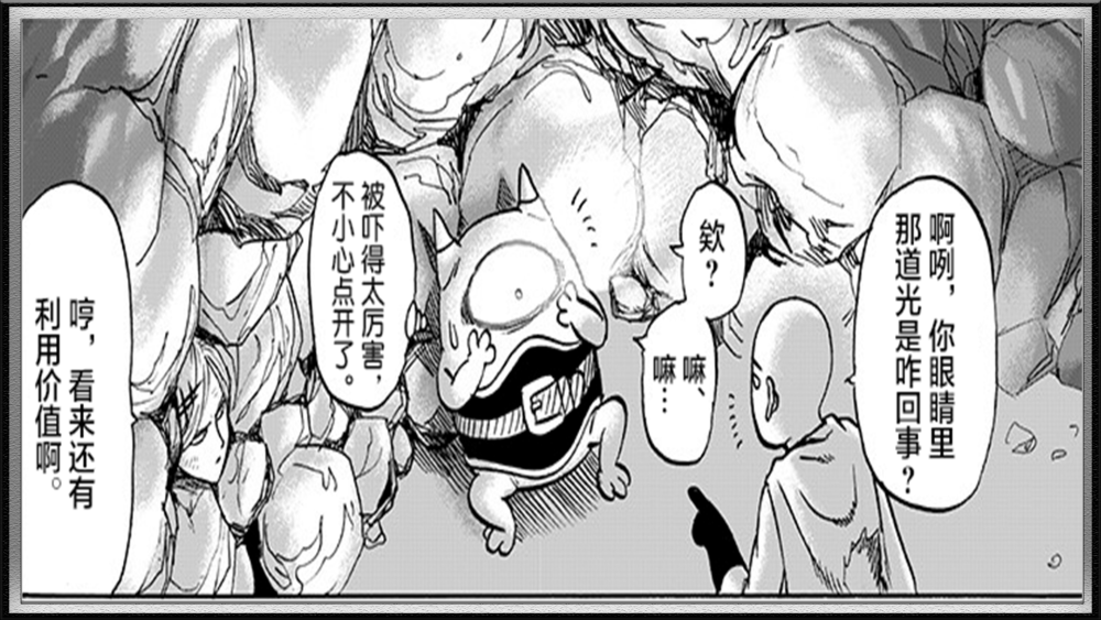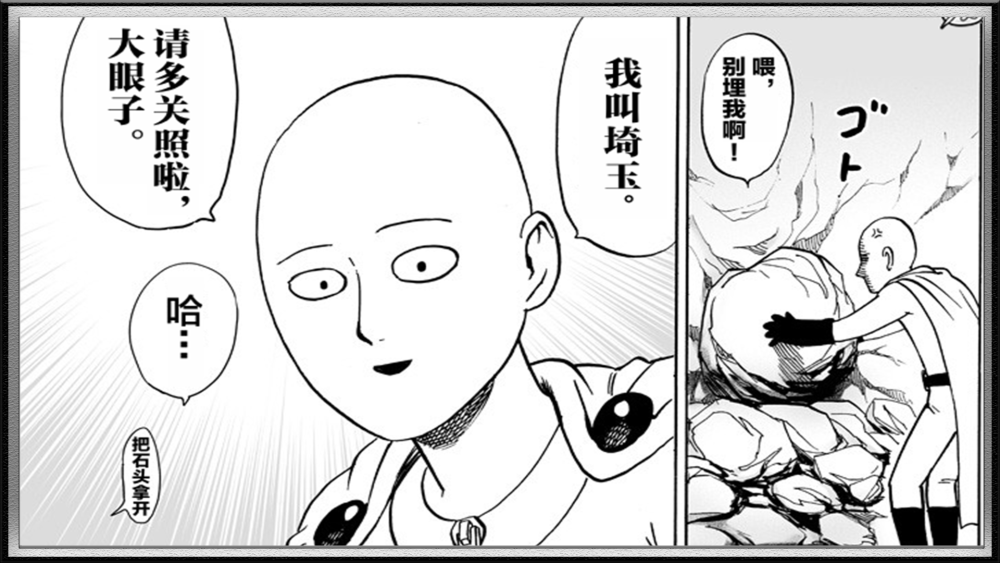 闪光的吐槽让琦玉气不打一处来,直接搬起一块石头堵住了闪光,然后向大眼子介绍自己。自己名叫做琦玉,请多关照,完全不在意此时被压在石头堆中的闪光。
