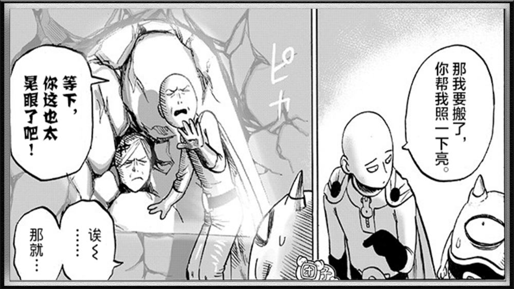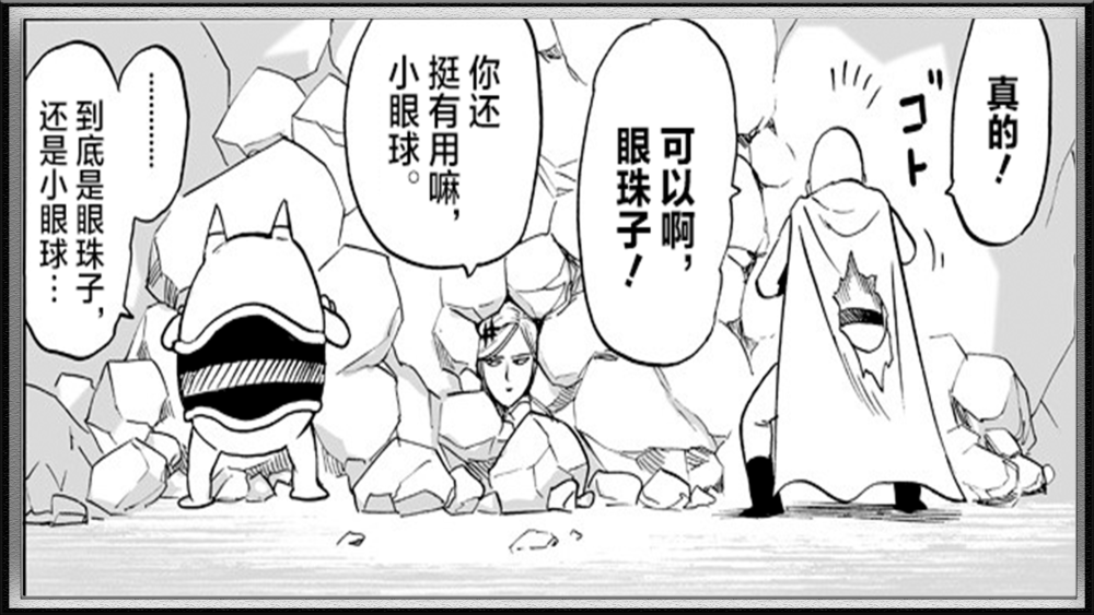 按理说闪光被埋,轻松的能够脱离出来,但因为担心自己的脱离会引起二度坍塌,所以让琦玉帮自己搬动周围的石头放自己出来。琦玉便让大眼照亮一下周围方便自己搬石头,大眼作为工具人丝毫不敢怠慢,直接放射出光芒却被琦玉和闪光嫌弃太耀眼了。