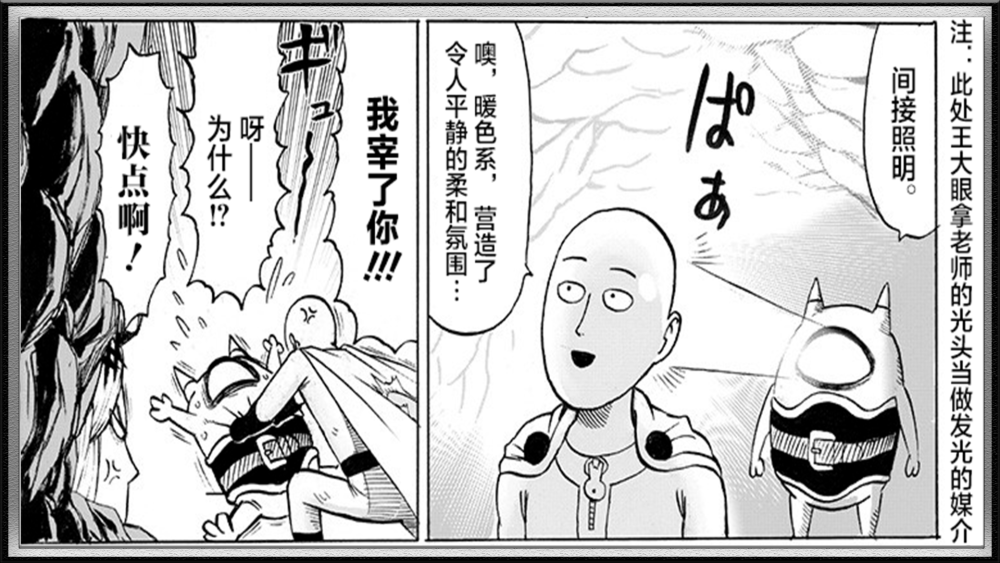 这下该怎么办呢?怎么才既能不耀眼又能够提供足够的光明呢?这时大眼想出了一个非常不错的办法。用自己的光直接照射在琦玉的光头上让琦玉的光头成为一个电灯泡,这个方法直接让琦玉恼火了,是在挑衅我的秃头吗?大眼还一脸无辜地表示“为什么?”大眼实力不济,但头脑还是满灵光。