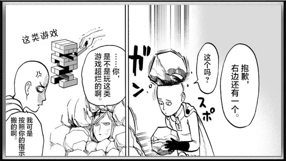 处理完照明的问题之后琦玉开始搬动闪光周围的石头,却无奈自己头脑不机灵,搬动一块石头之后头顶上必定会掉下来一块石头。甚至还被闪光吐槽你玩积木类的游戏是不是运气特别差呢?琦玉恼火却也很无奈。