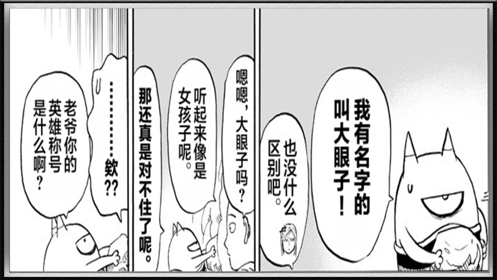 大眼从登场至今一直没有表明自己的名字,终于在琦玉和闪光的名字吐槽之下,大眼说出了自己的名字,叫做“大眼子”,这个名字真的很女性化。大眼知道闪光的名号,对眼前的这个光头却一无所知,所以也问起了琦玉的称号。