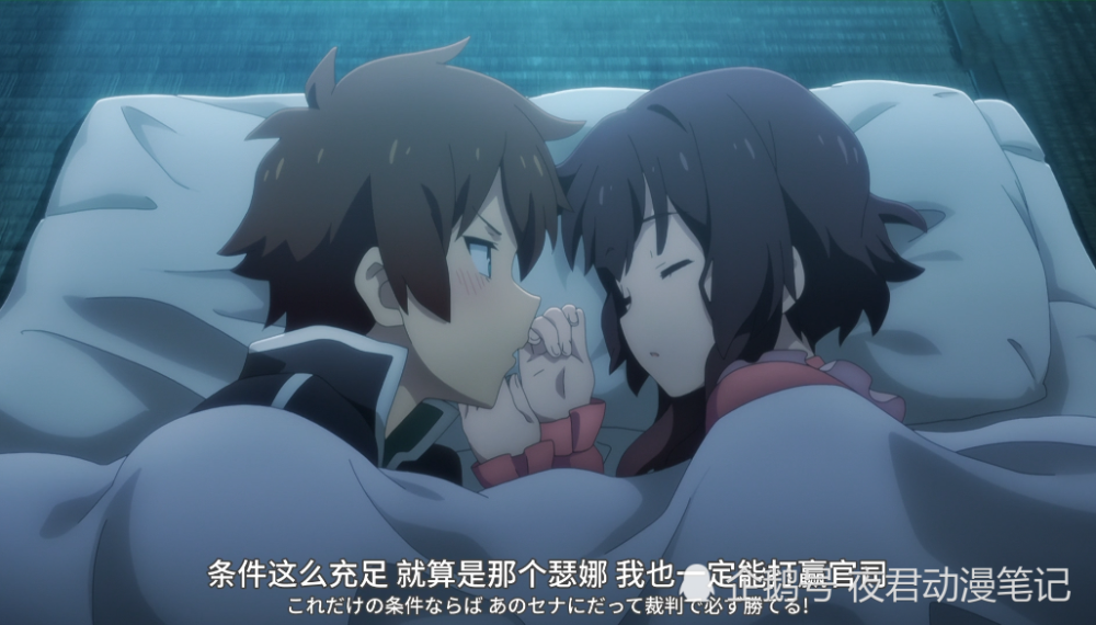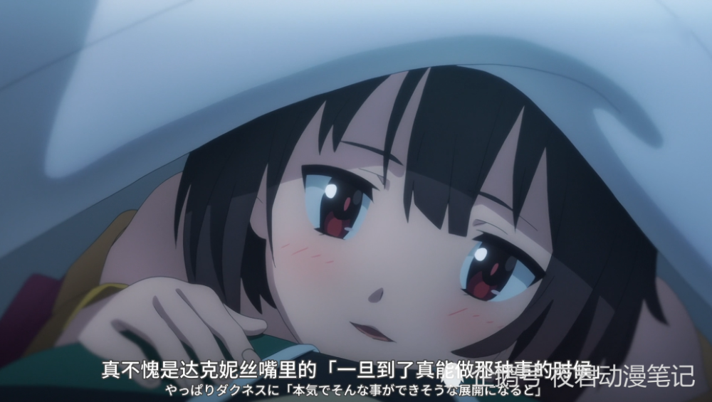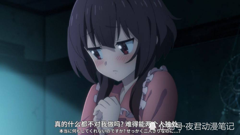 首先,剧场版动画中对这一晚的描写是直接到了晚上,但是大家可以试想一下,头一天「和真」就准备图谋不轨,有这前车之鉴「惠惠」怎么可能还敢在家里睡觉?~事情是这样的,这一晚惠惠收拾行李准备再去「悠悠」家过夜,不过被老妈施放的【昏睡咒】给弄昏了,所以她就没跑成~男主「和真」又释放冰魔法把窗户也给封死了,也就是车门焊死让惠惠再也别想跑了,可惜魔王军入侵这个好事就又被破坏了~