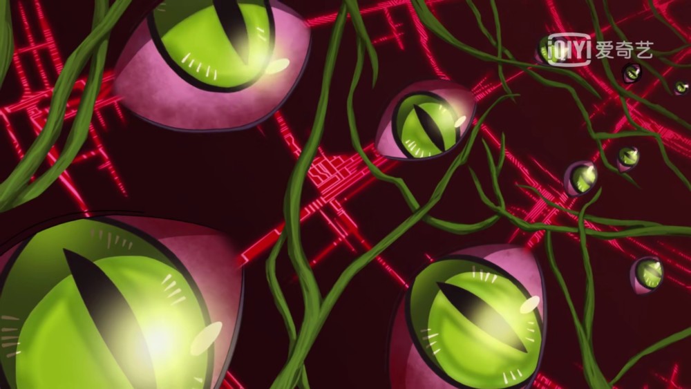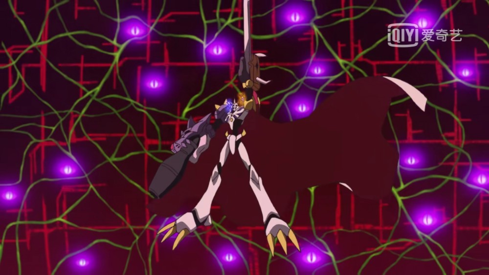 之后奥米加兽开始了反攻,利用暴龙剑将其分支的藤蔓直接砍碎,自己持续向阿戈斯兽展开进攻。利用加鲁鲁炮直接将其击飞,我们看到阿戈斯兽身上也泛起了红光,看来这一炮对其还是有很大伤害的。愤怒之后的阿戈斯兽究极体直接展开自己的领域,将藤蔓插入地层,整个世界都化身成为了自己的领域,而我们因此也看到了阿戈斯兽的千眼领域,殊不知这一做法直接让自己走向了毁灭。