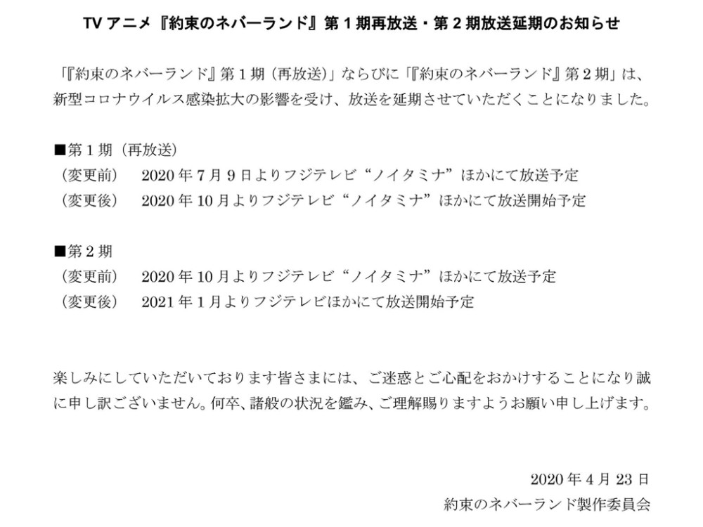 而现在,十月新番也开始受到了影响,并出现了宣布延期上映的动漫作品,那就是《约定的梦幻岛》第二季动画。从官方给出的公告来说,一共有着两个信息。第一个是原定于七月再放送的第一季,从七月延期到了十月。这一个信息,对于我们来说,影响不是很大,也并不重要。