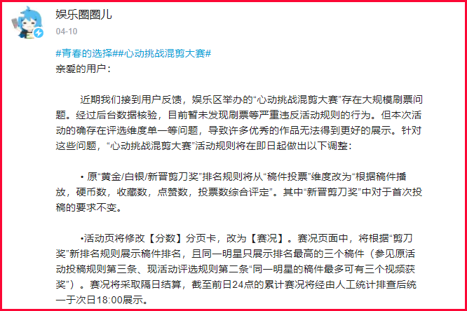 例如最近的一件事,就是很明显的例子,在B站举行的“心动挑战混剪大赛”中,某明星粉丝公然刷票,使排名前列的视频全是这位明星。并且面对众多用户的举报,B站首次给出的回复居然是没有作弊行为,直到后面才改口。而这件事也让许多不满B站的用户,开始离开它前往A站,并称B站现在或许不应该叫哔哩哔哩,而应该叫“肖哩肖哩”。
