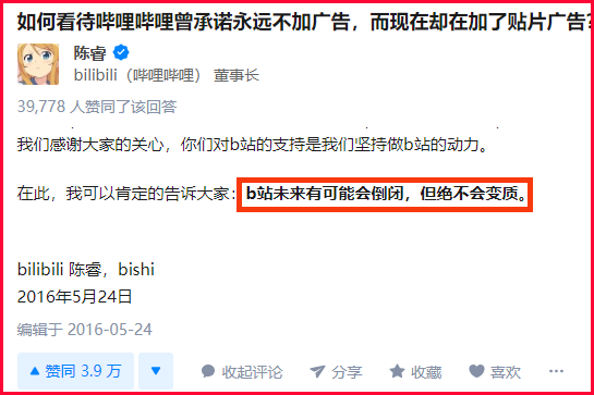 这其实就是其他圈子进入B站,引起一些老用户反感而已。可这真的有用吗?随着B站的不断发展,各种各样的圈子进入B站本就是一件很正常的事,就算你再怎么不想,它还是会发生。所以B站还是B站,只是面对的用户群体发生了改变,这让我又想起了数年前B站董事长说过的一句名言:B站未来有可能会倒闭,但绝不会变质。