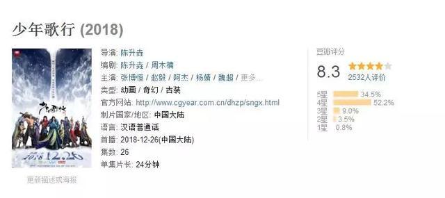且就《少年歌行》动画质量来讲,首播就在B站收获9.8(目前是9.3)的高分,各平台上的屠榜与制霸几乎呈现出了一种狂欢的现象。其豆瓣评分也是稳定在8.3分,被一水的五星吹炸的同时也被很多本来是路人的观者吐槽不已……