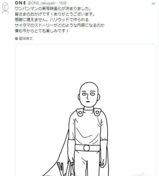 《一拳超人》漫画的原作者One老师也专门发了一张贺图来庆祝《一拳超人》真人电影化,并且表示自己对这部电影非常期待,同时也感谢大家的支持。