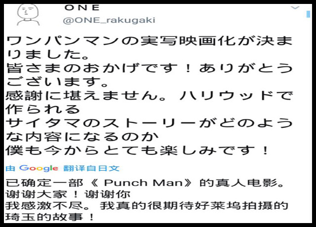 当观众津津有味地去讨论现实是否有人会有像饿狼、黑光、龙卷和吹雪这样身材的时候,ONE和JUMP在推特上发布了一个令人兴奋的消息:《一拳超人》将推出真人版电影。当一部动漫走到一定的高度的时候,剧场版、OVA、同人版和真人版就会相继推出市场,《一拳超人》的独特剧情加上村田的画工,这部作品将会以真人版的形式和大家见面。