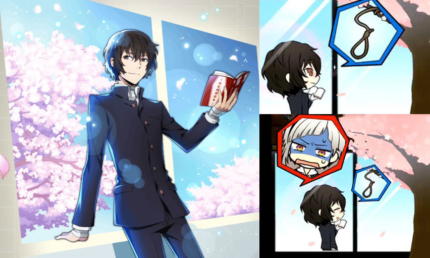 新学期来袭同时樱花也盛开了,大部分的学生都会欣赏樱花的美丽,但《完全自杀手册》不离手的太宰治却与众不同,他欣赏的是樱花树干的强壮,不禁发自内心地感叹:“这树干是多么美好,非常适合上吊!”