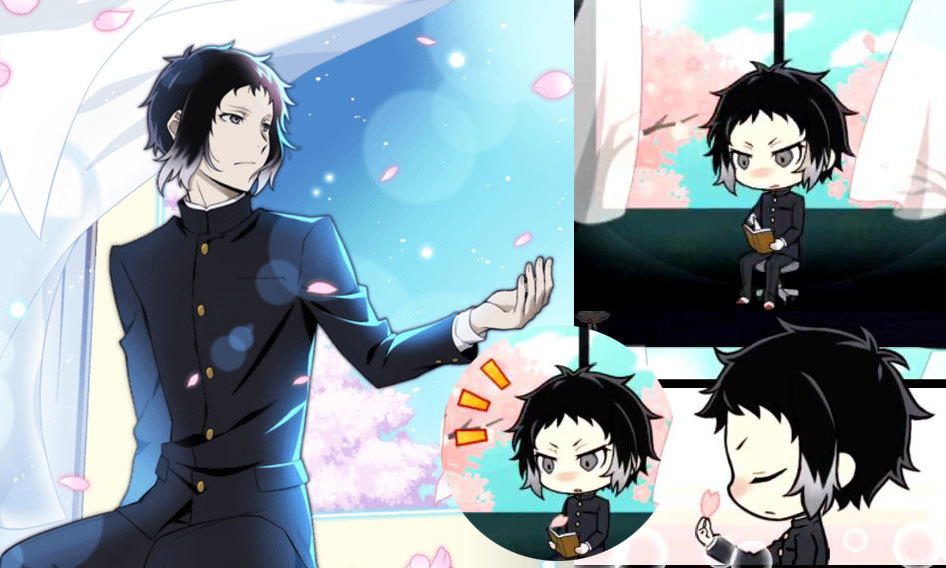 上完课的芥川,对刚才老师说的知识点有点模糊,于是趁着课余时间,自行补习。突然,飘来一花瓣,轻轻地落在了芥川的书本上。满脑子都是认真学习的芥川,即使在上学的路上开满了樱花,也被他忽略了。也许,这片神奇的花瓣就是想要告诉芥川,神经不能一直紧绷着,适时放松,更能事半功倍。于是,芥川坐在了窗边上,开始欣赏这漫天飞舞的樱花。