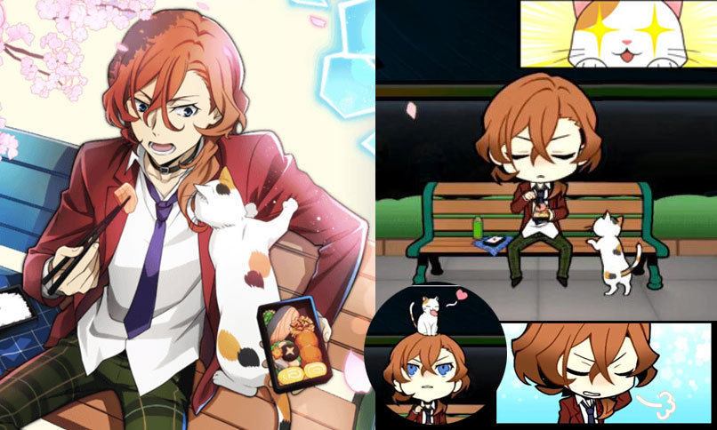 午休时间到了,中也找了一张长椅,舒适地享受自带的美味便当。中也的便当看起来营养均衡、荤素搭配得宜,还有解腻的绿茶,连小猫都吸引过来了。中也正要把美味的鱼块吃掉的时候,小猫一下子就跳到了中也的肩膀上。中也还疑惑着这是哪来的小猫的时候,小猫就迅速地夺走了中也的鱼块,但是中也并没有生气,只是一脸“拿你没办法”,叹了一下气。