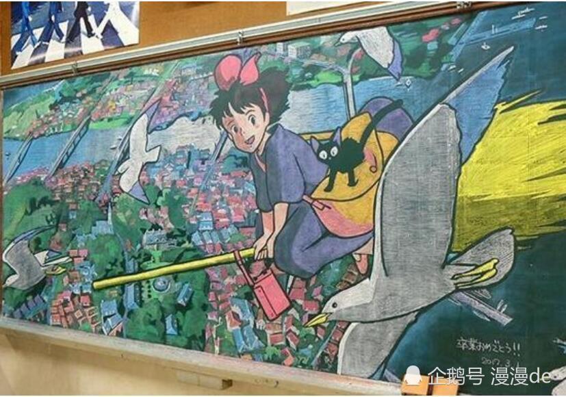 不仅有《鬼灭之刃》,还有一些其他动漫的黑板报,还有宫崎骏的动漫。千与千寻中的经典场景,也被画在了黑板报上。以前的黑板报,都是关于学习的内容,都是比较正规的内容,现在被动漫场景占据了,也改变了整个教室的画风,也算是多元化文化的呈现吧。