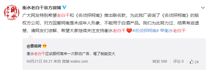 然后没想到的是衡水老白干官方真的回应了,他表示:因为广大网友特别希望老白干跟《名侦探柯南》进行联动,为此他们特地找上了《名侦探柯南》的版权方公司寻求合作,只是对方回应了以柯南是未成年人形象,不能够喝酒为理由而拒绝。也就是说其实不是我们不想联动,而是对方不给,我们已经努力过了。