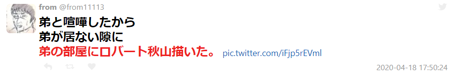 不过在自己的房间里看着这些搞笑艺人的肖像画,而且还是这么大幅的秋山龙次肖像画,弟弟的感觉应该还是很微妙的吧,尤其当他知道这是针对他的恶作剧时,所以这位网友也在推特上说了,弟弟在看到自己房间墙壁变成了这个样子后,不禁发出了叫声。