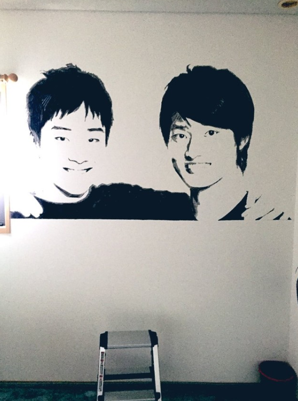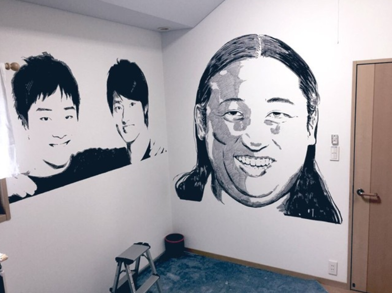 网友在弟弟房间的墙壁上绘制的名人肖像画,一幅是大规格的,日本著名搞笑艺人秋山龙次的肖像画,另外一幅是这位网友和弟弟都十分喜欢的知名搞笑二人组合JaruJaru,这对搞笑艺人组合的短剧和漫才都很有意思,感兴趣的人可以去网上找来看看。