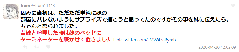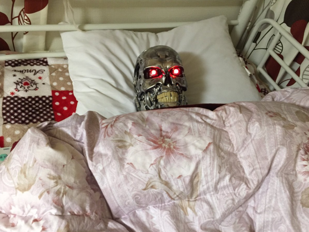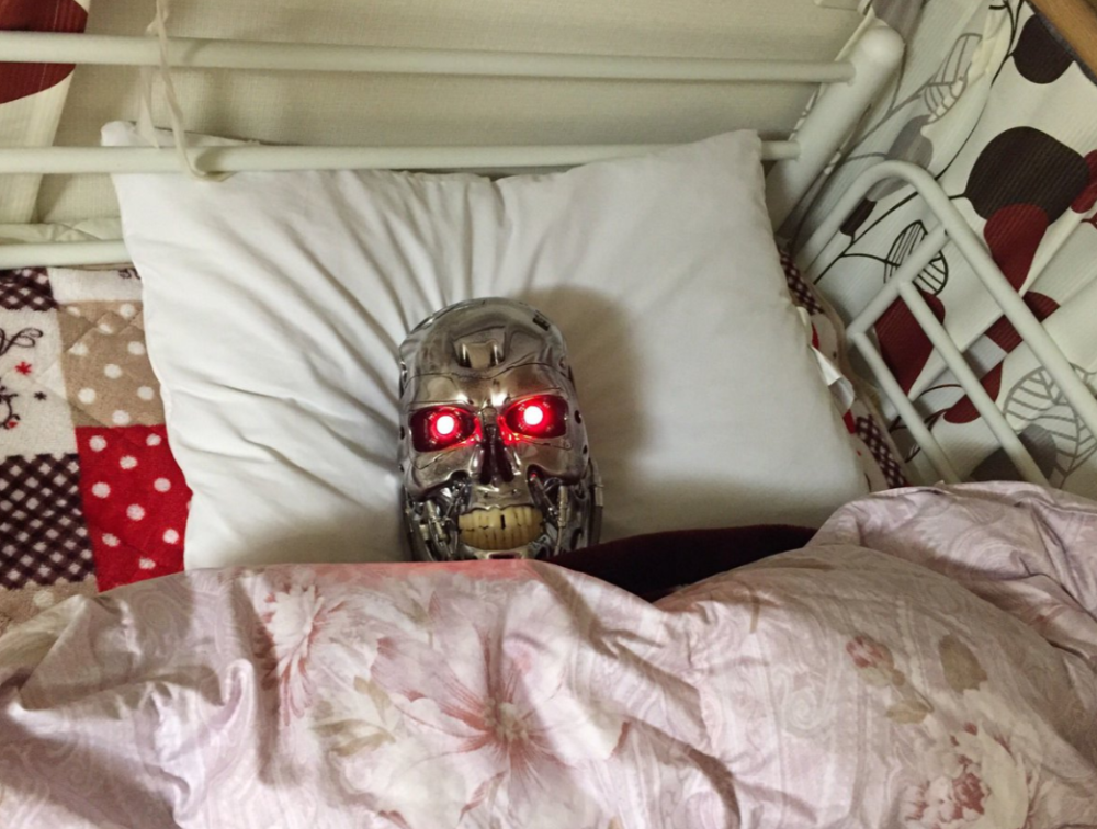 而网友在跟妹妹吵完架之后,对妹妹所做的恶作剧就是:在妹妹的床上放入终结者……