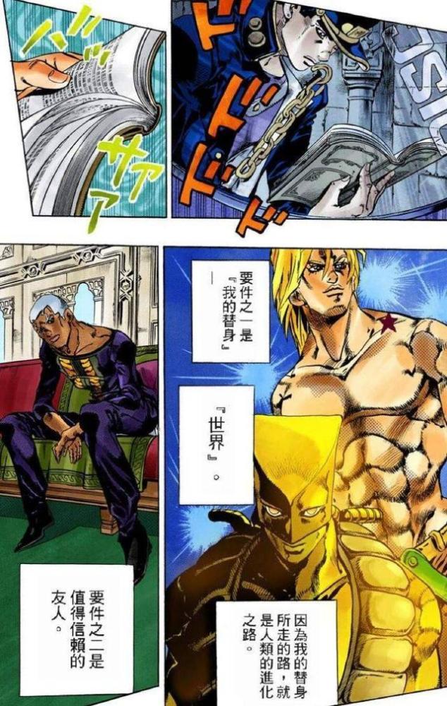 至于天国计划的具体内容,独乐在此就不赘述了。虽然DIO至死都没能实现这个愿望,但是吸收了绿色婴儿的神父,却将DIO的子嗣引召而来,企图让他们成为自己走向天堂的助力。神父一共吸引了DIO的四个儿子,除了乔鲁诺一直没有现身外(根据漫画描述,他可能已经抵达佛罗里达某处),其余三人都已出场并展示过自身的替身能力,然而他们作为DIO的儿子,并非都与DIO相像,至于谁和父亲DIO的相似度最高,对此独乐就大致分析并谈一下自己的看法。
