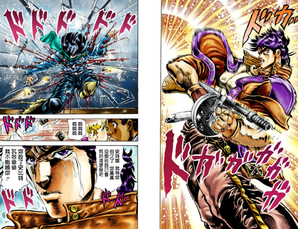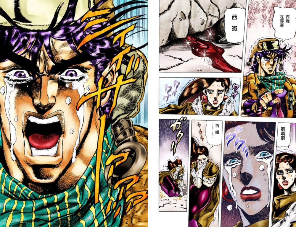 这就是乔瑟夫这一生中我们所得知的流泪场景,一共四次,当然除了那种笑得流泪的那种。男人有泪不轻弹,只是未到伤心处。乔瑟夫·乔斯达都是为了朋友而落泪,为了身边之人的逝去而悲痛。