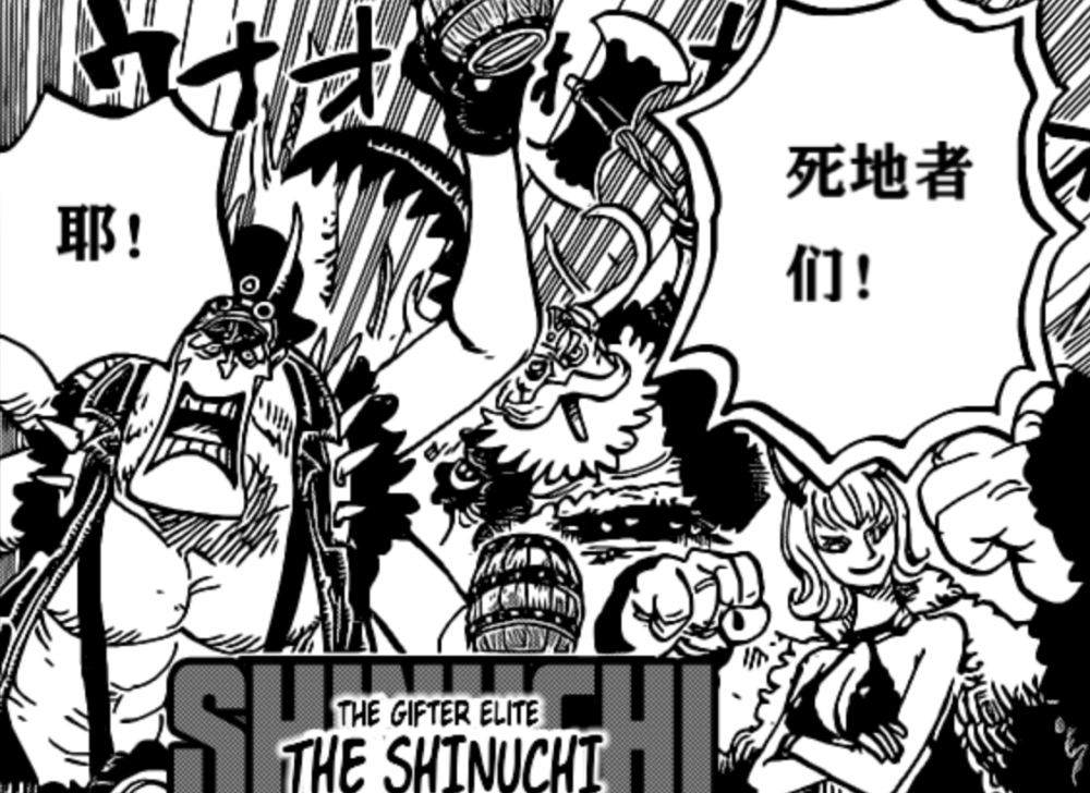 凯多一方的杂鱼军团相信读者们已经略知一二,百兽团的主要杂鱼构成分为smile果实能力者所组成的“给赋者”、吃下smile果实未获得能力的“愉悦者”、尚未吃下smile果实的“待命者”,除了这三个军团之外,本话奎因还提到了“给赋者”中的精英“shinuchi”,这些应该是吃下smile果实并成为了真打的能力者,并不包括霍金斯这类真打干部。
