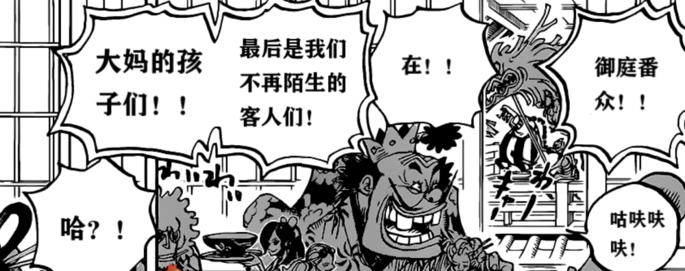 凯多一方的宴会主持人是百兽团第一活宝奎因,这位大看板很可能是凯多团第一“好领导”,他对所有人的态度都很友善,就算直属部下飞六胞总是不给自己面子,也不会生气或发火。奎因友善开朗的性格让他深受百兽团成员爱戴,自然也成了众望所归的主持人,在他的主持下,凯多一方的实力构成也清晰了起来。