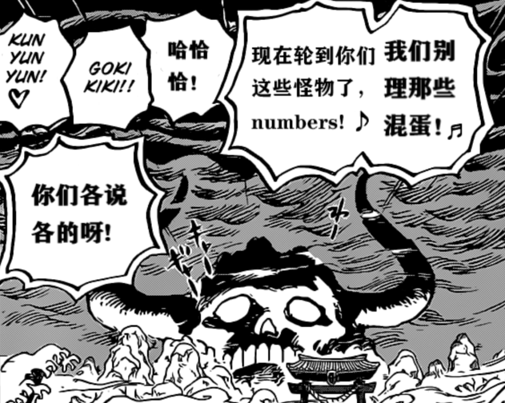除了杂鱼军团之外,奎因还在主持中喊到了凯多一方的精英战力。凯多一方的精英战力包括刚刚缔结联盟的大妈团的干部们,以及被奎因成为“怪物们”,但目前仍未正式露面的Numbers,他们应该是百兽团的旗下海贼势力,都有着称霸一方的势力,并且从剪影来看,有的成员二十年前就开始跟随凯多了。