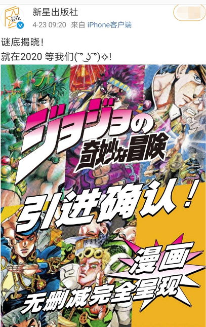 4月23日,新星出版社在其社交账号上官宣《JOJO》将要被完整引进内地的消息,大部分漫迷都表示非常期待。据已经公布的信息透露,此次引进的是《JOJO》漫画的第1到5部,至于第6部到第8部是否能够在内地看见实体版本还需要等待后续的反映。