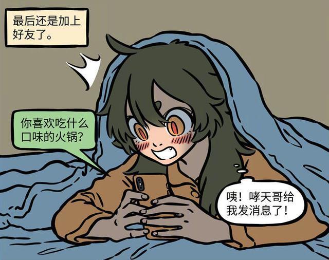 就这样瓦陶陶的手机内存硬是被啸天给拍的照片所占满了,果然啸天的智商不怎么高。不过命运又似乎眷顾瓦陶陶,因为经历多次失败后,终于添加上好友了。体现瓦陶陶痴女属性的时刻到来了,啸天只不过发了一句你喜欢吃什么口味的火锅。