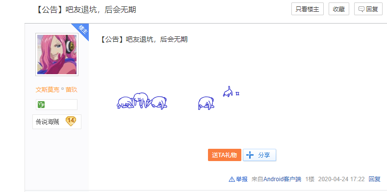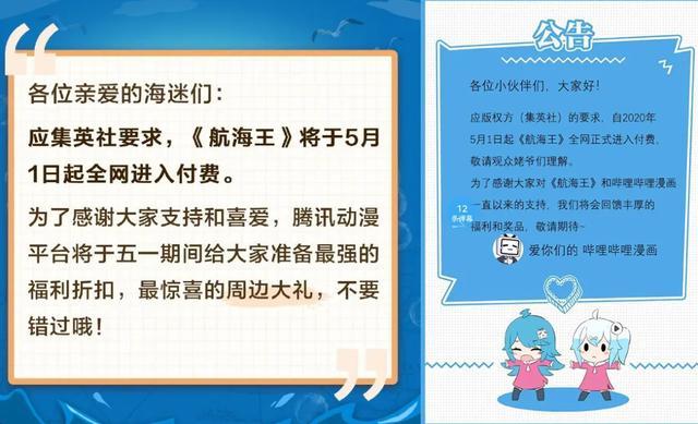 在19年的11月份,海贼王的主要汉化组鼠绘翻译宣布停更。但在网上里还有一位之前是鼠绘汉化组的大佬,在鼠绘停更后,改名民间汉化后出来更新。被誉为白嫖党最后的船。而就在昨天,鼠绘创始人王某因为侵犯著作权罪被宣判,获刑三年,缓刑三年,并处罚金八万元。并且腾讯宣布在五一之后,海贼王要全网付费。面对双重压力,民间汉化在昨天宣布退出贴吧,有缘再会。这也就是说,如果想看动画的海贼王就只能去爱奇艺用vip去观看,而看漫画的话,只能去腾讯漫画付费观看。