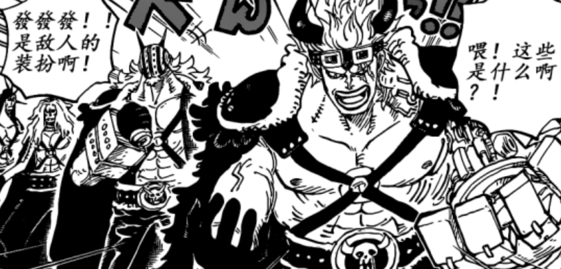 此时锦卫门想到了一个主意,他用自己的能力让所有人都穿上了敌人的服装,其目的就是为了混淆视听,不让敌人迅速地察觉到,路飞和基德等人都穿上了新的服装,对于路飞来说,新的衣服会让他很兴奋,毕竟他的性格比较天真,而基德就会觉得这样做太没必要,而且看上去很愚蠢,不过为了打凯多一个措手不及他也没有过于在意。