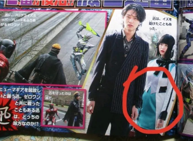 在假面骑士零一五月份的杂志图中,大家可以看到伊兹的肚子,竟然似乎有种“怀孕”的感觉,非常的大,怎么都有四个月了,这就让人误会大了,这是谁的孩子,要知道骑士迅可是守护在她身边,而且伊兹的眼神也是非常的微妙。再加上金属簇飞蝗怒砍燃烧猎鹰,或人这么愤怒,显然三个人有着解不开的关系。