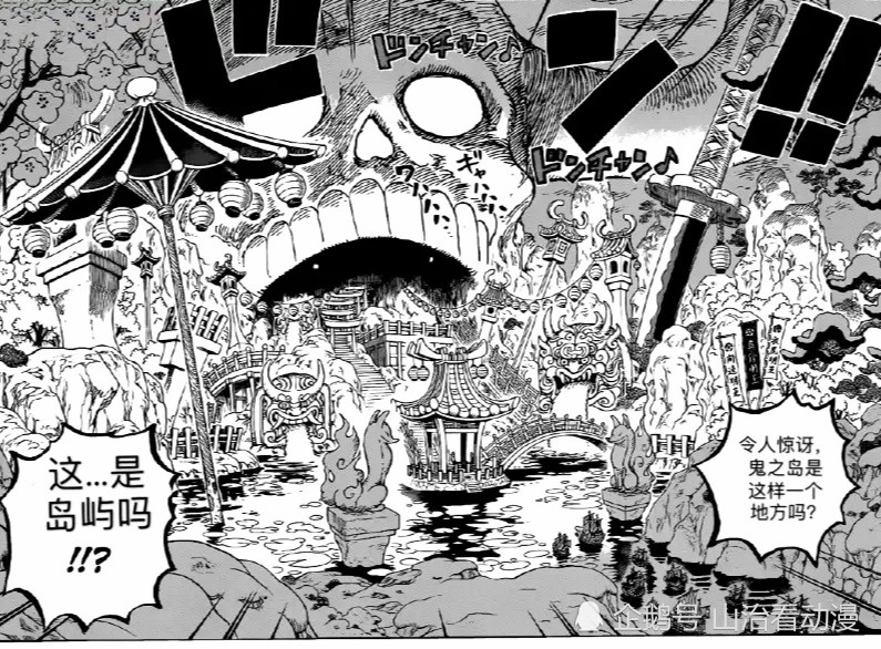 当他们的大船队靠近鬼岛正门时,乌索普发现了百兽海贼团的放哨小喽啰,乌索普再次大显身手,他使用植物瞌睡星迷晕了几个小喽啰。鬼岛内部正沉醉在喜悦之中,连站岗放哨的人都喝醉了,草帽一伙的大船队才能顺利进入鬼岛。鬼岛内部的样貌出现了,风景如画,亭台楼阁样样都有,还有一把巨人族使用的名刀。