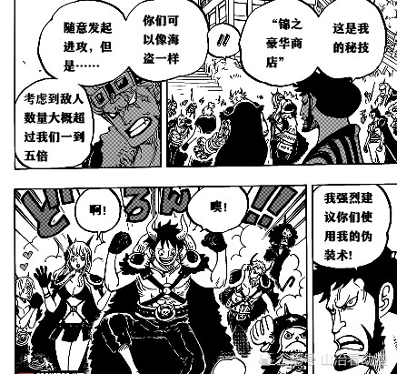 在鬼岛中出现了众多的百兽海贼团的部下,草帽一伙刚刚登陆就遇见他们,为了不暴露身份,锦卫门使用了伪装术,让大家穿上百兽海贼团的衣服,草帽一伙全员换新装,路飞对这身衣服很满意,娜美身上的衣服越来越少。