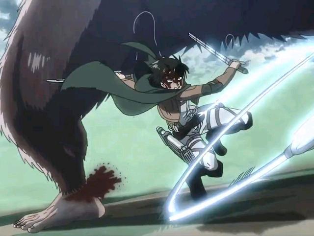 兵长在进攻女巨人和兽之巨人的时候使用了陀螺升天砍法,一阵操作之后,巨人们四肢经脉被砍断,只能坐在地上懵逼地看着这个地表最强的男人。看到兵长释放绝招,我才知道为什么他那么矮小却能当上兵长。