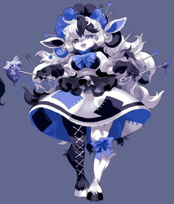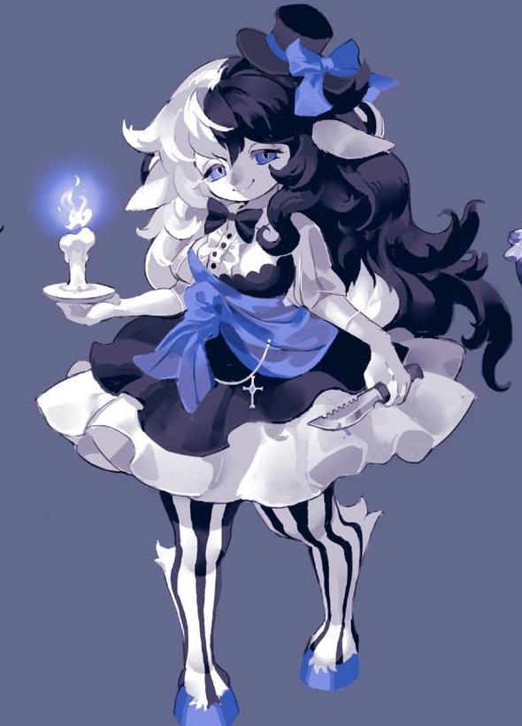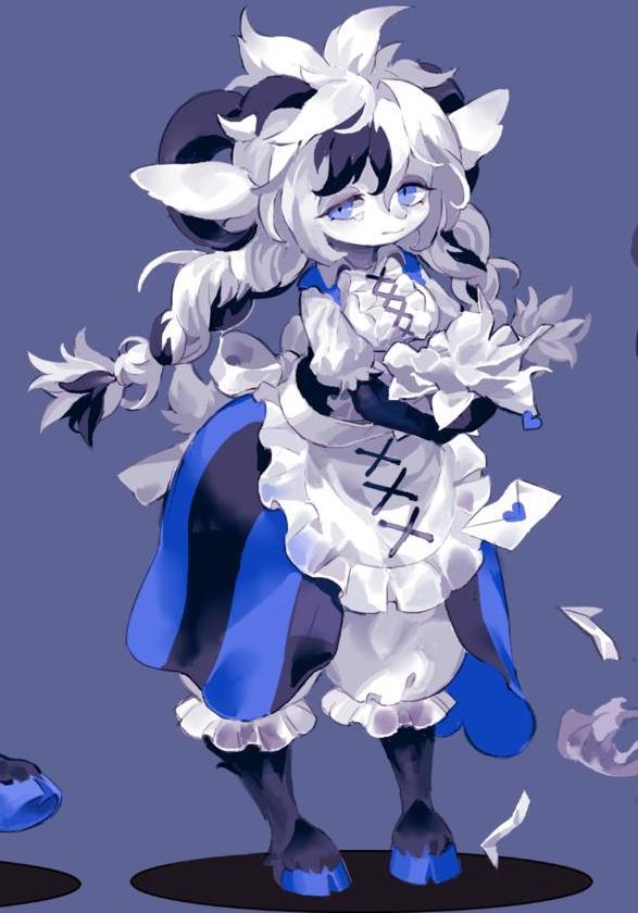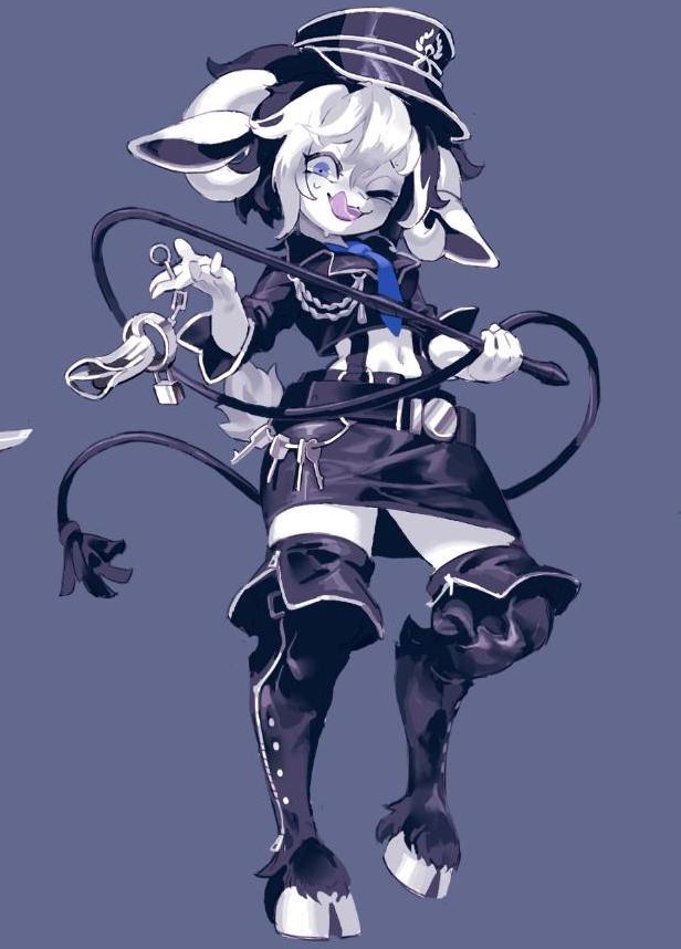 据说西方传说里,恶魔的形象就和山羊挺像,有着羊角和蹄子,这些变成美少女模样的羊们的形象不知道有没有参考恶魔的经典形象,反正看相貌是十分可爱,甚至还带点妖艳的。上面两幅作品的山羊美少女身上穿的看起来像华丽的华服,下面这位则是有点狱卒的感觉,配合上脸上的表情,很有小恶魔的感觉啊。