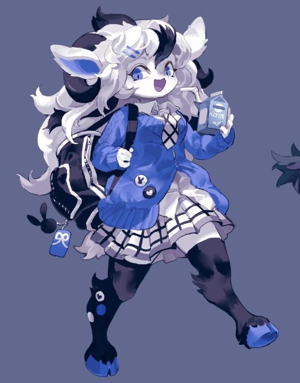 我个人最喜欢的是下面这幅,一副学生妹打扮的羊族美少女形象,穿着学生制服,背上背着包,手上拿着牛奶,似乎是准备去上学的样子,很有生活气息,真的太可爱了。