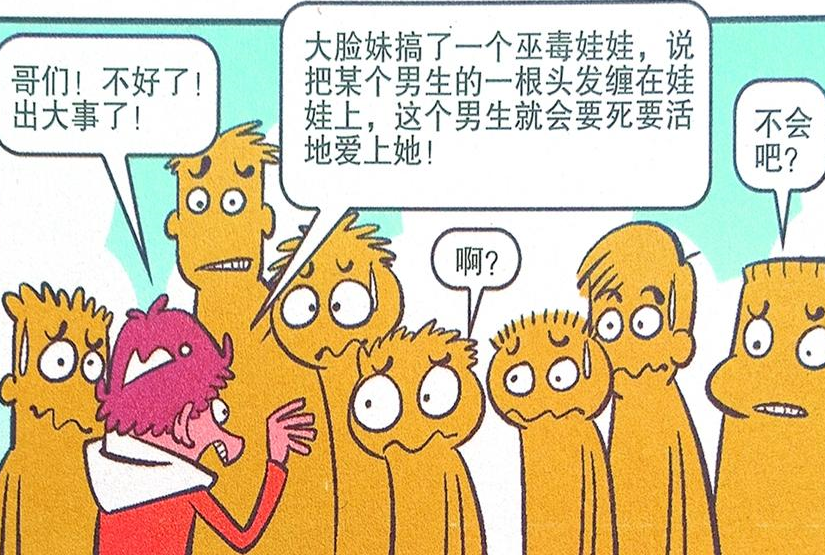 这天阿衰也不知道是从哪里听到的消息,说是大脸妹搞了一个“巫毒娃娃”,只要拿某一位男生的头发缠住在娃娃的身上,那么这个男生就会爱上大脸妹的,阿衰就把这个小道消息告诉了班里的全部男生,男同学们听到阿衰说的这个消息之后,真的也是大吃一惊。