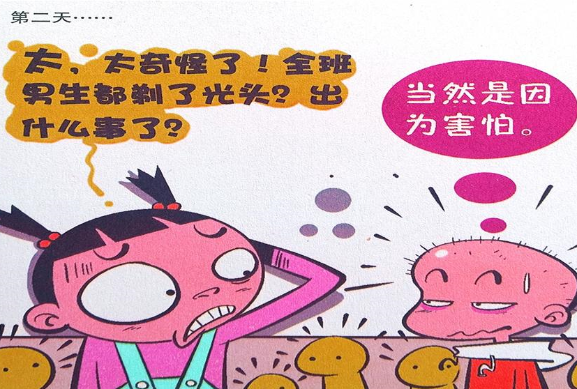 第二天,大脸妹也发现了班里男生们都有点奇奇怪怪,因为不仅阿衰还有其他的男同学都一夜之间都成了光头强了?大脸妹也不知道这到底是发生了什么事情,大脸妹看着阿衰就问,这都发生了什么事情了呀?阿衰心想着当然是因为害怕啊,因为怕会爱上大脸妹。