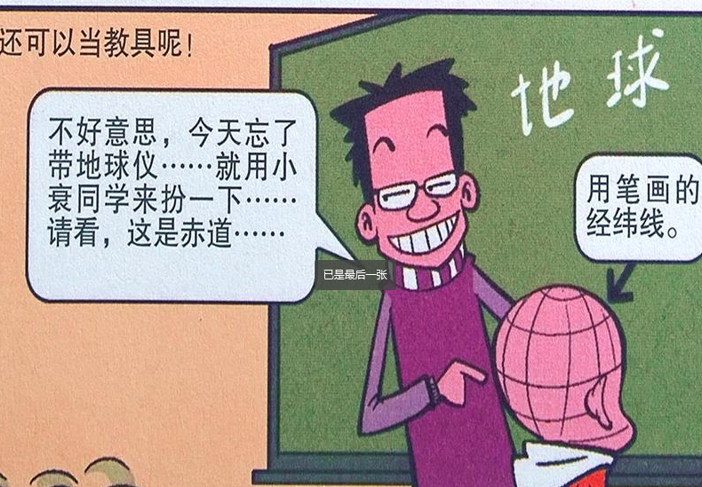 阿衰现在的光头形象,不仅给大脸妹恶搞,在课堂上老师还让阿衰的头来当“地球仪”,把阿衰的光头画出一个地球仪,然后给同学们上地理课呢,不过阿衰觉得这样能够帮上老师,也是一件好事情,不枉费自己去剃了光头,还是多少有点用处的,现在的阿衰觉得自己能帮到老师很自豪呢。