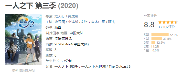 对于一部动画来说,评分固然是衡量品质的因素之一,但要说到最直观最关键的影响那还得属用户的期待。这不,《一人之下》做到了,而与此同时这部被动漫迷们期待了两年之久的第三季也总算在前两天到来了。