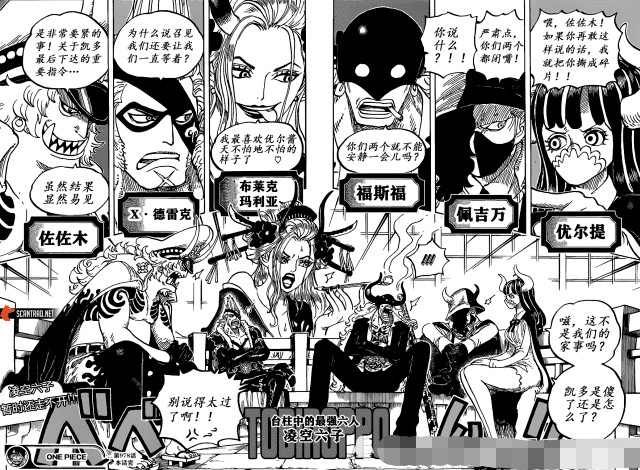 福斯福在坐在所有人的中间,他的特点是戴着头盔一样的面具,把整个人的面容全部包裹住让人看不清他的面貌。乍一看他这个装扮和肿头龙十分的像,肿头龙主要攻击手段就是用头部攻击敌人,如果福斯福是肿头龙形态的话配合武装色攻击的话,敌人被他撞一下会不会当场挂掉呢?从外形来看福斯福极有可能是肿头龙形态恶魔果实能力者。