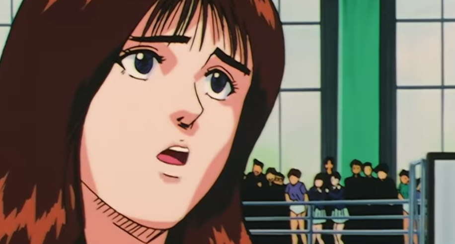 这是第一集的画面,当时晴子找到了樱木,认为樱木是一位非常厉害的运动能手,直呼樱木会不会打篮球,随后被晴子拉去了篮球场,而后晴子还展现了自己上篮的技术,但因为晴子没有穿篮球鞋,结果摔了一跤。其实这里晴子是走光了的,现在也是看不到这一幕了,只看到删减版的晴子,就很随意地往前一扑,没看到最后走光画面。
