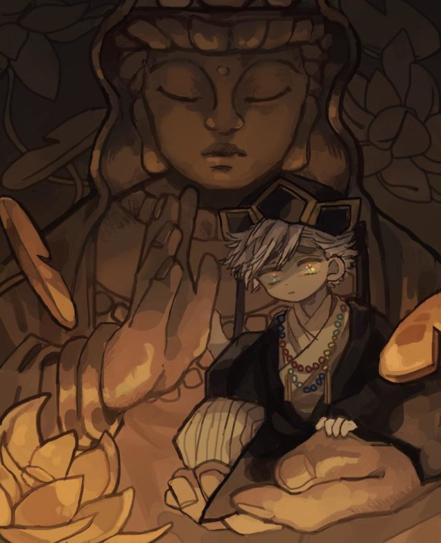 童磨自出生起就没有任何感情,内心毫无情感波动并且丝毫不理解人类的情感,外加他天生白发和七彩眼眸,被他迷信的父母视为神之子,之后以童磨为教主建立了万世极乐教,靠着膜拜而来的人赚取钱财,来往之人会向童磨诉说自己的苦恼,之后童磨开始逐渐意识到自己的使命是把人送往极乐世界,由此开始,童磨开始走向堕落。