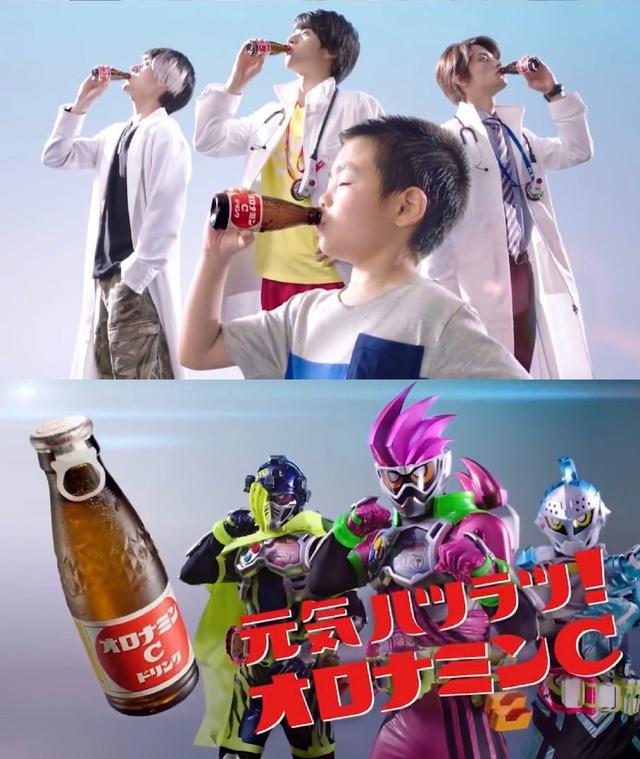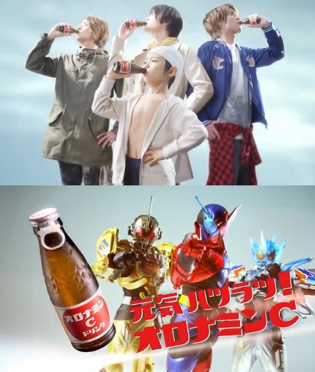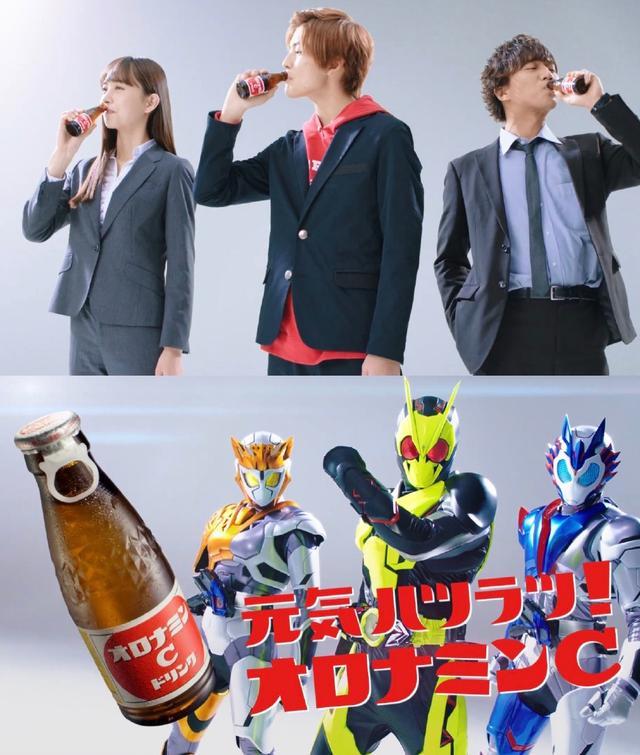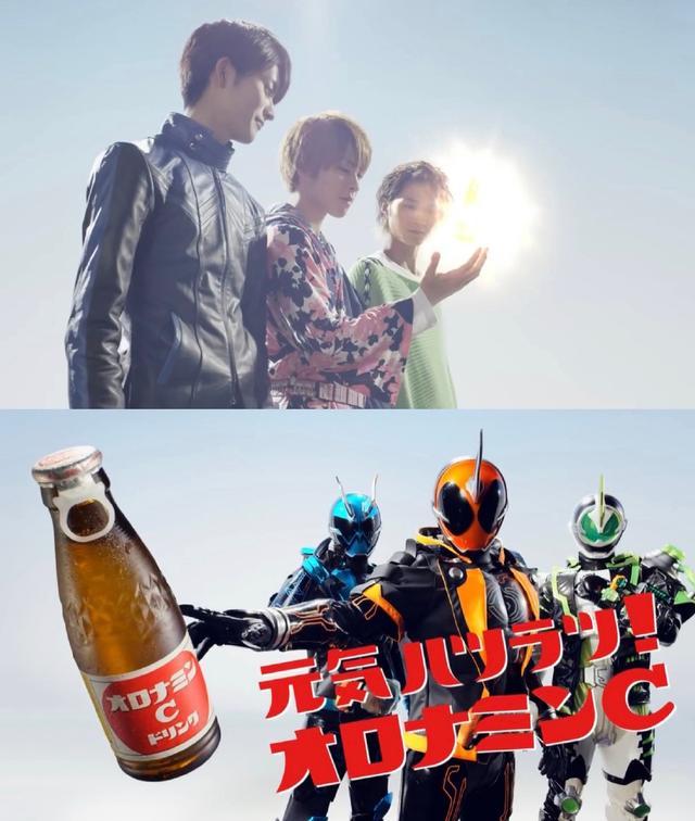 假面骑士ZI-O,当时拍摄的时候盖茨脸比较圆,三人凑一起还挺合适,就是盖茨性格和这饮料不算很搭。这饮料是Oronamin C维他命类的饮料,个人入手过一罐,味道和红牛差不多,就是量实在是有点少完全不够喝的,不推荐。