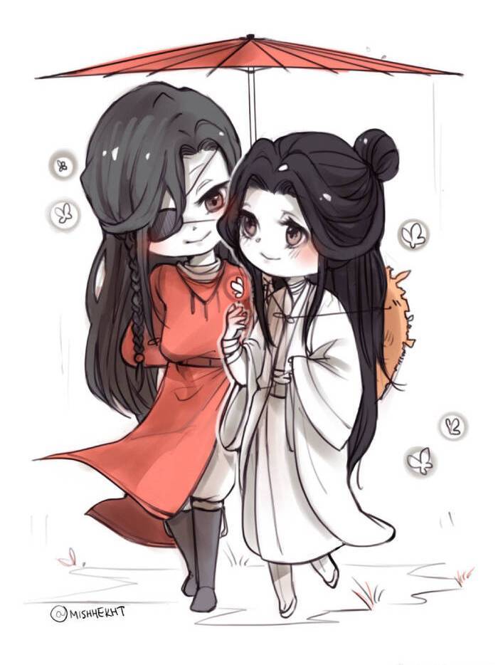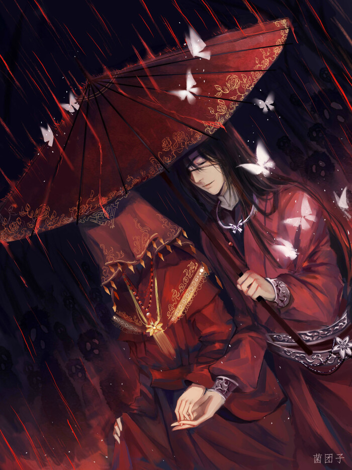 谢怜和花城与君山“初遇”,谢怜女装扮作新娘子,把花城当成了鬼新郎。花城牵着谢怜,并为谢怜打伞。谢怜不知道那是鬼界大佬花城,可花城确实故意的。当时花城的心情想必万分激动,内心已经有一万只土拨鼠在尖叫了吧,这是何等的快乐。