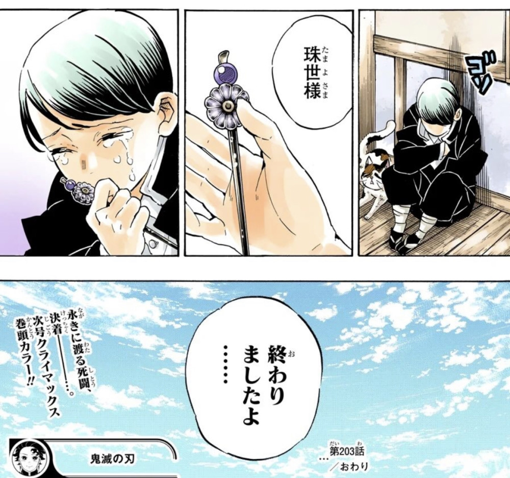 随着漫画第203集的更新,故事也逐渐落入尾声。鬼舞辻无惨身体被太阳毁坏,意志被炭治郎所抛弃,它是真正意义上的死去了!这也宣告了鬼杀队最终赢得了这场胜利!鬼杀队也沉浸在了胜利与队友回归的喜悦当中。
