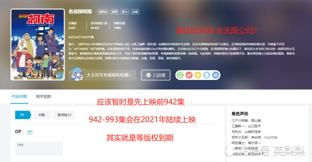 除此之外,B站所购买的《名侦探柯南》TV动画版权也仅仅只是一部分,简单来说就是暂时只能播出前942集,942集-993集会在2021年陆续播出,我推测是因为《名侦探柯南》TV动画942集-993集的版权在爱奇艺还没有到期,所以B站只能在2020年4月30上映前942集。不过,这也是很不错了,毕竟B站所购买的版权包含了日语和国语双配音。