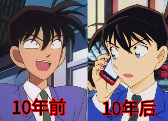 00后的动画发生了不小的变化,90后喜欢的二次元作品同样也没有逃过10年的变化魔咒。这是《名侦探柯南》中的主角工藤新一,从10年前和10年后的对比图可以看出新一的皮肤白了很多,眼睛细节改变尤其明显,让人不忍想要怀疑这究竟是不是同一个画师的作品。